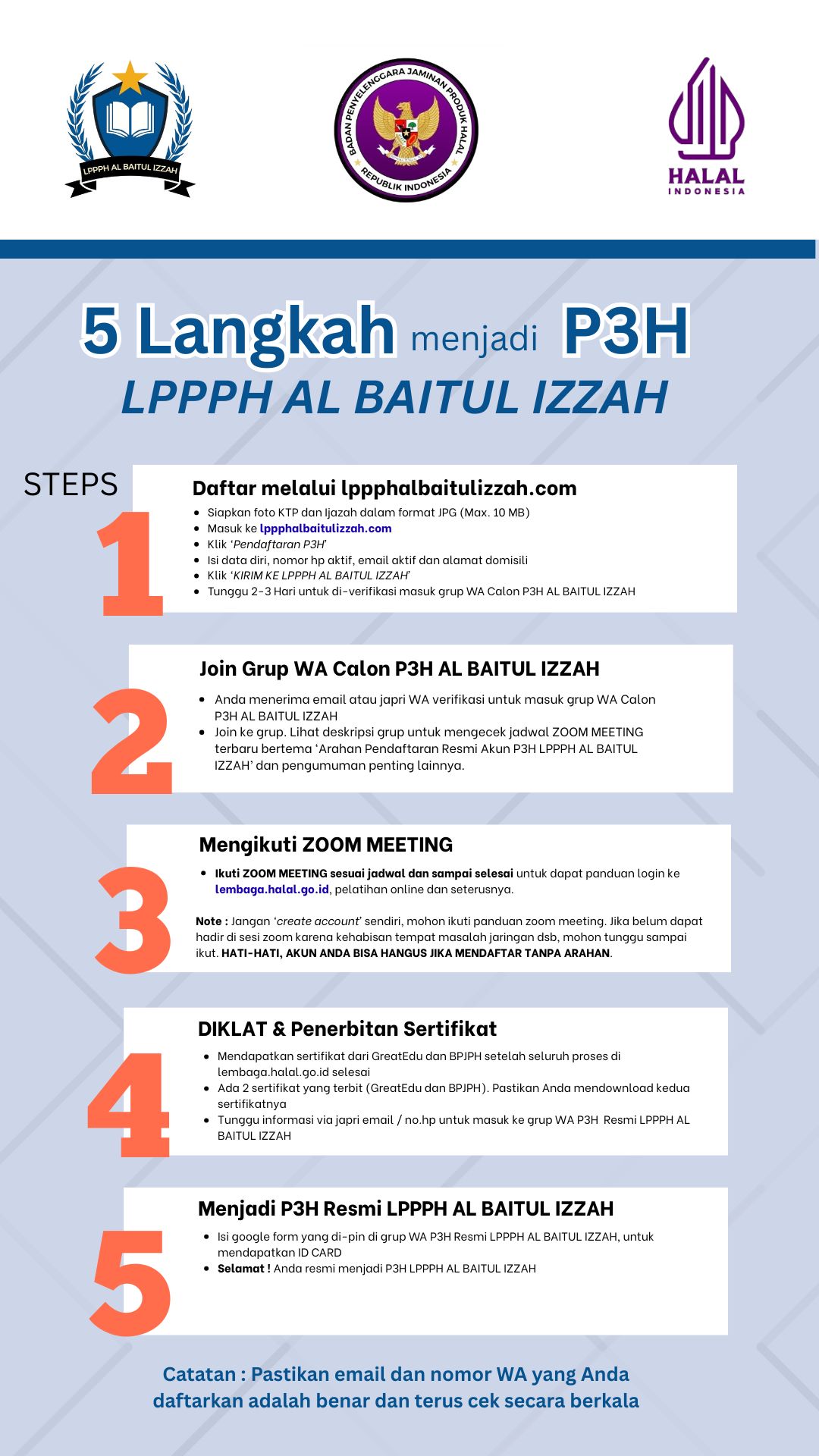 - Mengisi formulir pendaftaran P3H LPPPH AL BAITUL IZZAH online (link formulir online diberitahukan dalam grup WA Calon P3H AL BAITUL IZZAH)